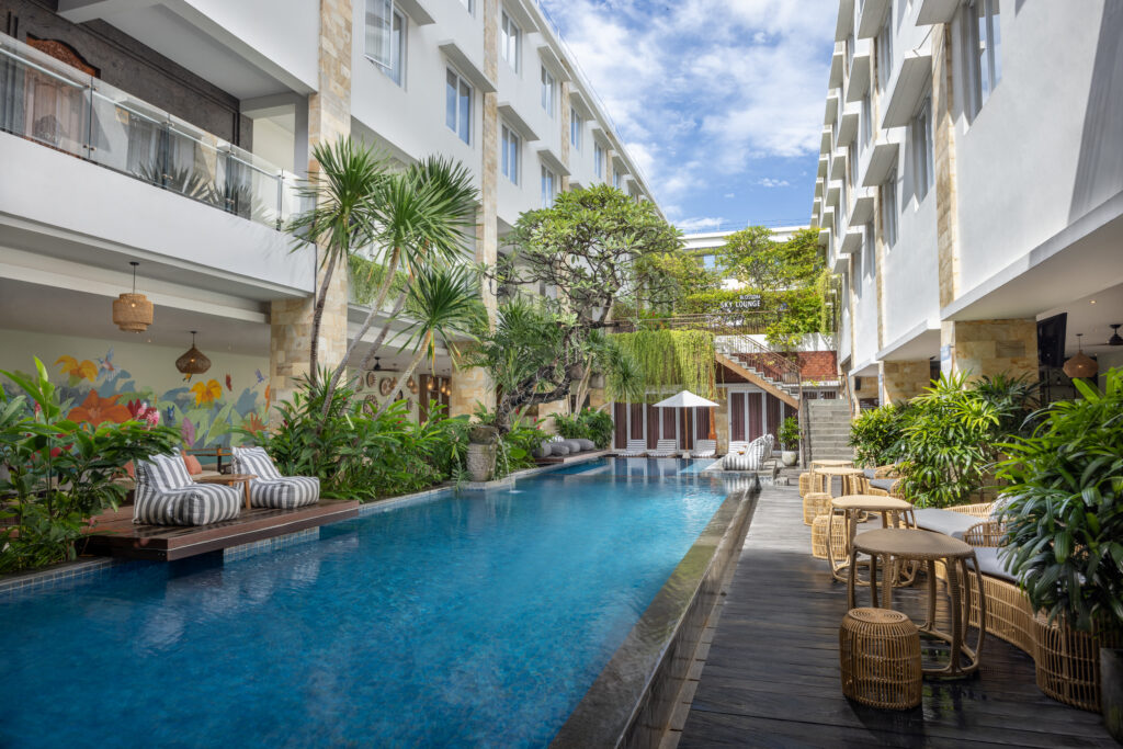 An outdoor pool with fresh plants on its side. Also with children pool, safe and sound experience for you.